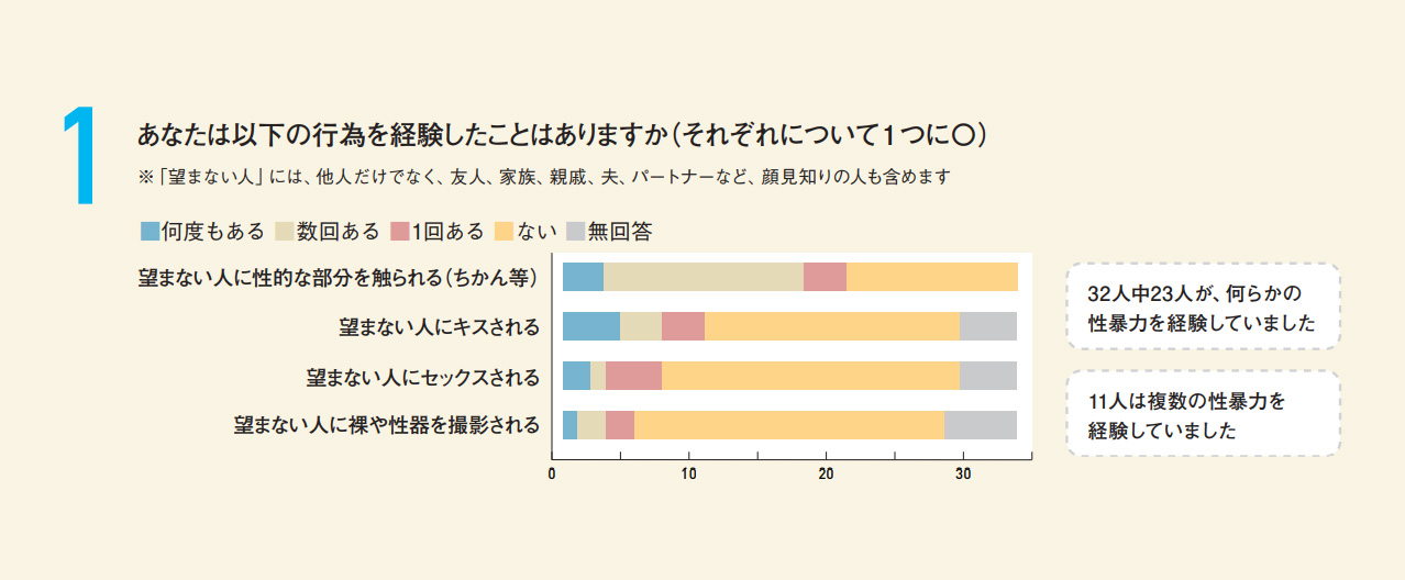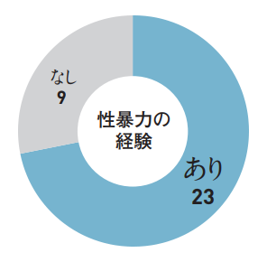 ●内閣府調査(2017年) では、無理矢理に性交等をされた経験があるのは4.9%(男性1.5%、女性7.8%)であったのに対し、今回のアンケート調査で「望まない人にセックスされる」経験があったのは、22%(男性0%、女性33%)に上る。